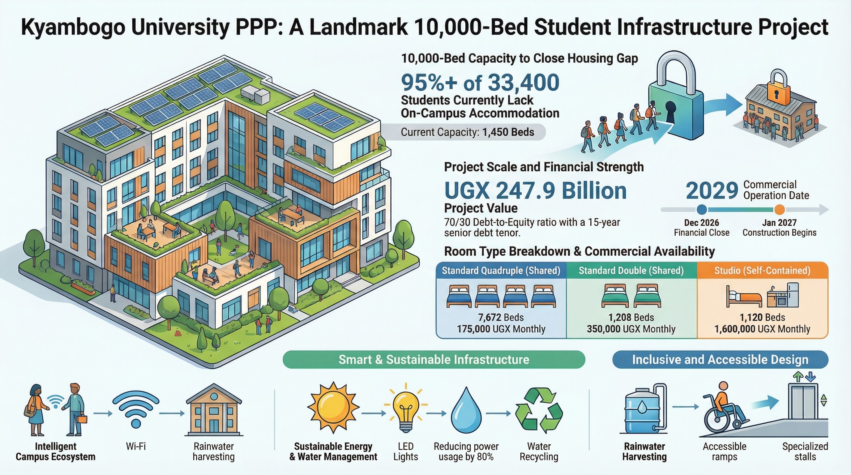The KYU Hostel project is a landmark student housing initiative at Kyambogo University. Utilizing advanced precast construction technology, we are delivering a 10,000-bed masterplan that provides safe, modern, and affordable accommodation for the student community, fostering a conducive environment for academic excellence.