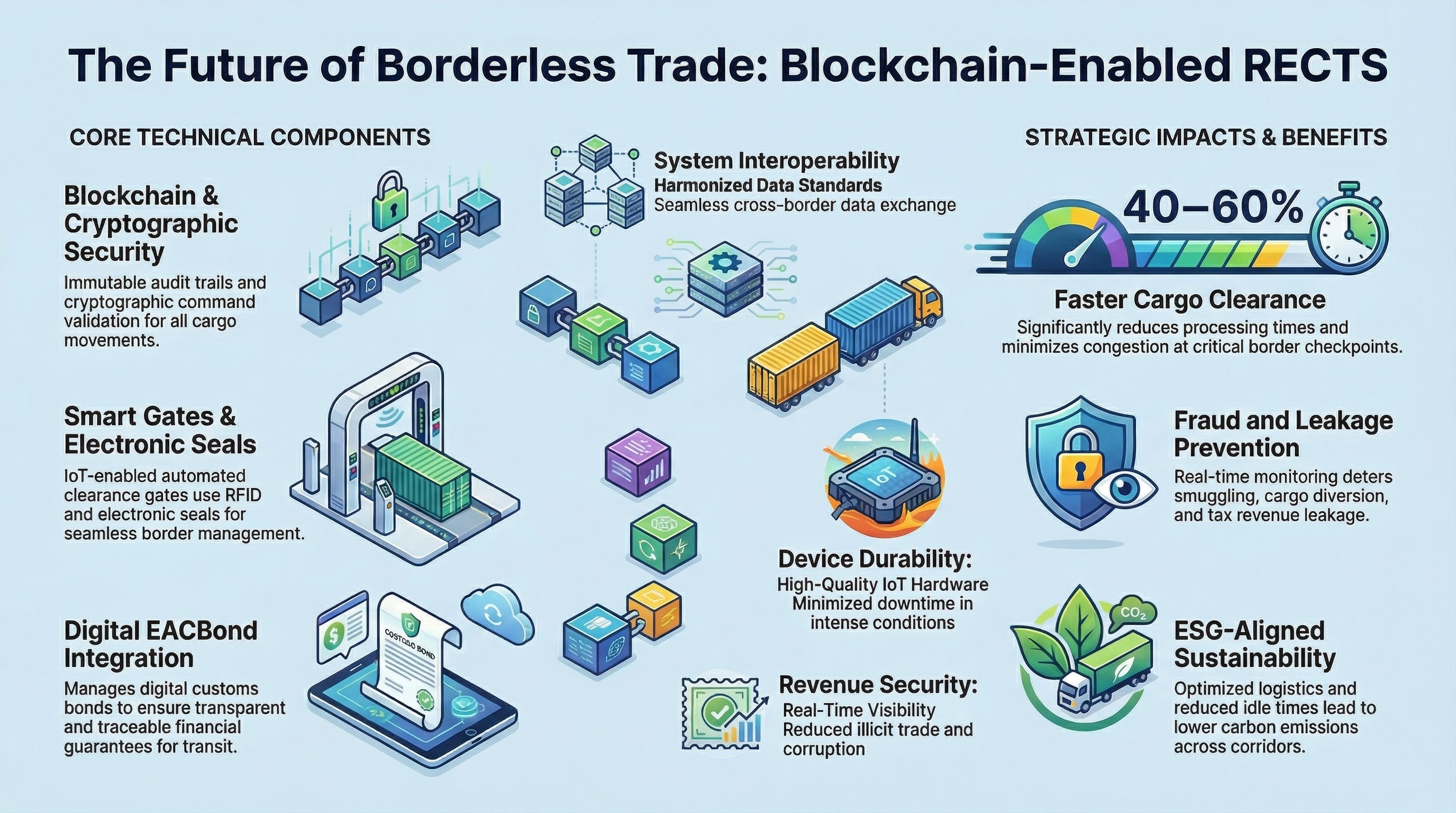 RECTS AI leverages Blockchain and Artificial Intelligence to provide an advanced Regional Electronic Cargo Tracking System. It ensures revenue protection, eliminates transit fraud, and offers real-time visibility for customs authorities across borders.